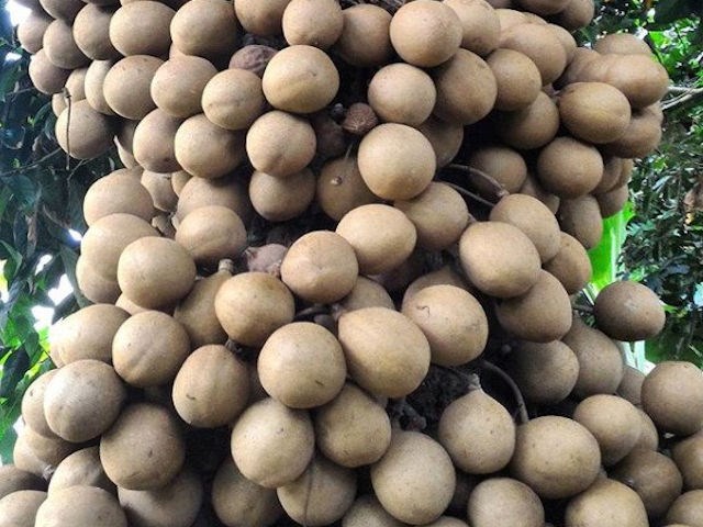 Fruits: Les fleurs femelles pollinisées donnent naissance à des fruits de la taille d'une balle de tennis (5-6 cm de diamètre), mûrissent du vert au brun en 6 mois (généralement de mars à avril), avec une texture légèrement verruqueuse. Les fruits sont mûrs, si la couleur est jaune ou brun clair (plutôt que vert) sous la peau rayée, contenant pulpe comestible, orange juteuse avec saveur épicée de mangue (décrit comme un goût acquis). Mangé par les chauves-souris et les rongeurs dans la nature, et devrait être protégé par ensachage 1-2 mois avant la récolte. Les fruits récoltés peuvent être conservés pendant 2 à 3 semaines à température ambiante. L'arbre adulte donne de 1 000 à 1 500 fruits par année, avec des variations dues à l'irrégularité des précipitations. Graines ellipsoïdales, relativement grosses (3cm de long), 4-6 par fruit.